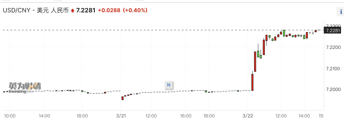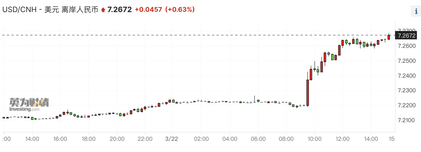 巴克莱中国利率、外汇策略师张蒙对记者表示:“初始触发人民币贬值的因素应该是隔夜美元对所有货币的强势走势。此外,人民币中间价也存在一定影响,市场正在重新调整预期,因为中国央行本可以将中间价保持在7.099左右的水平(就和过去一段时间一样),但3月22日的中间价为7.1004,接着就出现在岸汇率跌破7.2,触发了一些对冲基金的止损,可能是和期权有关。”