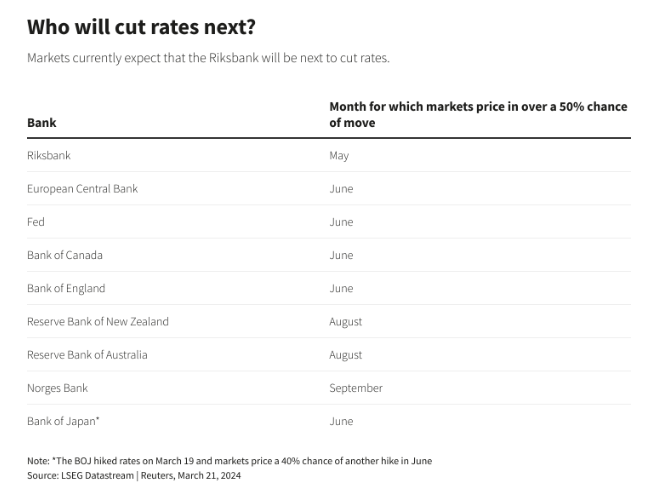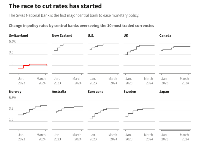 而当人们仔细研读各主要央行的微妙政策转变时,不难发现——相比于市场对美联储年内降息押注从年初的六次缩减为三次,其他一些主要央行的利率预期路径,其实倒反而出现了更多的鸽派转向,周四提前降息的瑞士央行,或许只是其中的一处缩影。而同行的“衬托”,倒是反而给了美元实现反弹的理由……