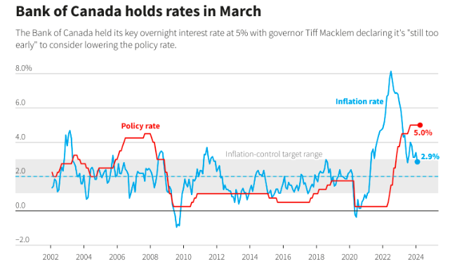 加拿大央行将于4月10日发布下一份利率决议,市场普遍预计该央行将继续把关键隔夜利率稳定在数十年来的最高位——5%。加拿大央行在3月初的议息会议上再度按兵不动,并表示潜在的通胀势头意味着现在考虑降息还为时过早。市场认为加拿大央行今年将降息约60个基点,最有可能从6月份开始。