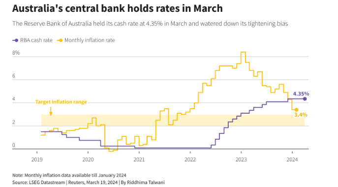 澳洲联储本周二将利率维持在4.35%的12年高位,但软化了原先的鹰派立场——放弃了之前货币政策声明中出现的进一步加息的警告。市场目前最新认为,澳洲联储首次降息可能出现在8月或9月。