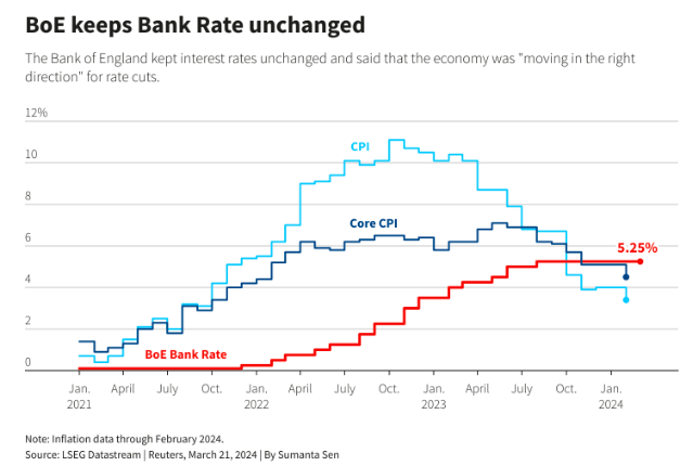 英国央行周四维持利率在5.25%的16年高位不变,但行长贝利表示,经济正“朝着正确的方向发展”,因此有必要降息。同时,两位英国央行内部最为鹰派的决策者都放弃了继续投票支持加息,这是一个较为明确的政策转变信号。目前市场最新定价显示,交易员认为英国央行在6月前降息25个基点的可能性略大于不降息的可能性,同时完全认为在9月底前的三次会议中会有两次降息。