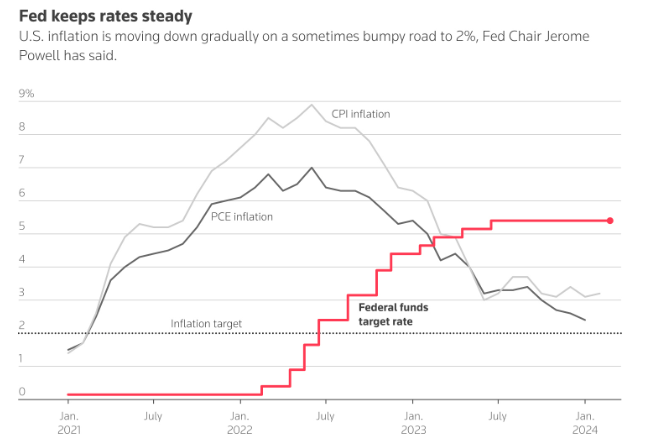 美联储本周三连续第五次会议将联邦基金利率目标区间稳定在5.25%至5.5%。而与决议本身相比,更值得注意的是,美联储点阵图仍预计年内会降息三次,这也与当前利率掉期市场的预期相吻合。目前业内预计美联储首次降息最有可能在6月份进行。