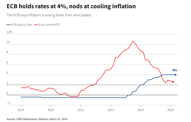 欧洲央行本月早些时候将借贷成本维持在纪录高位,但朝着未来降息迈出了一小步——表示通胀放缓的速度快于几个月前的预期。市场预计今年欧洲央行将有望降息约90个基点,6月份首次降息的概率约为80%,一些欧洲央行决策者似乎也赞同这一观点。不过,市场对欧洲央行降息的押注依然可能会发生变化,这在一定程度上将取决于美联储的动作。如果在美联储之前太早降息,欧洲央行将面临欧元疲软的风险,这可能会重新引发通胀。