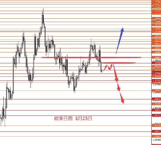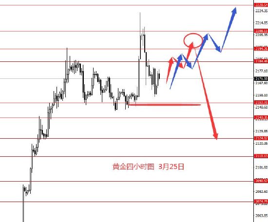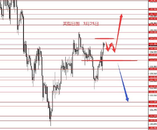 3月25日,美指上周冲高回踩再拉涨,整体震荡上行,走了紫色线行情。从图形来看,上周收盘较高,已走出不确定区域,后市向上运行的概率较大。周初关注上方104.60区域强阻力,在没成功上破前,本周在下方区间震荡修整的概率相对较大些,震荡修整后向上拉涨概率较大,月末前直接拉涨并上破104.60的概率偏小些。本周关注104.60-130.60区间修整行情,上方关注105.80强阻力。今日没有具体操作策略,只有大概思路。