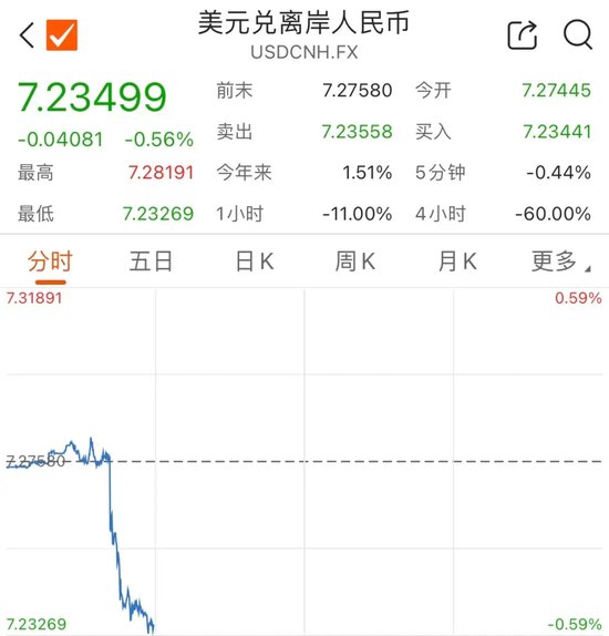 今日早间,在岸人民币对美元汇率开盘上涨逾200点,顺利收复7.20大关。与此同时,离岸人民币对美元直线拉升超400点,接连升破7.27、7.26、7.25、7.24四道关口。