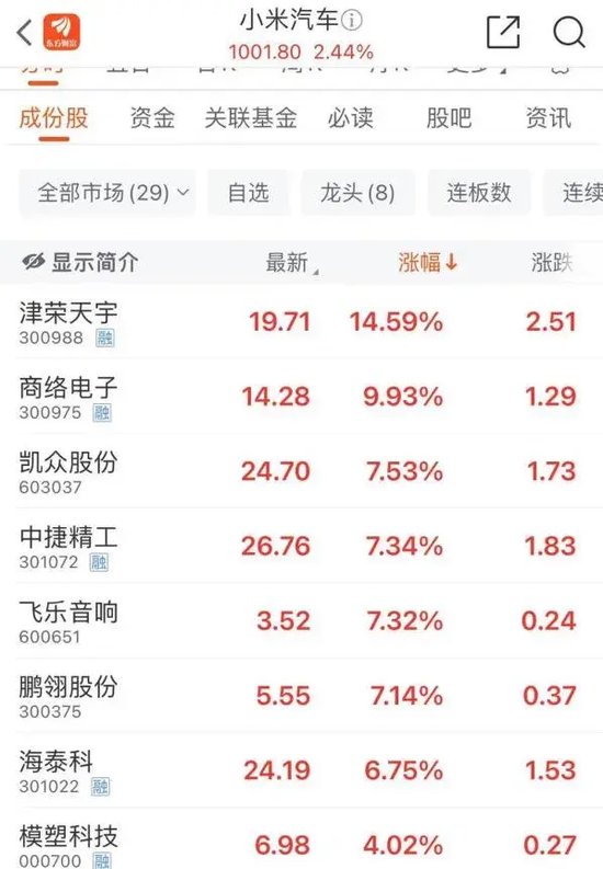 3月25日,小米汽车概念股拉升,截至午间收盘,津荣天宇涨超14%,商络电子、凯众股份等跟涨。