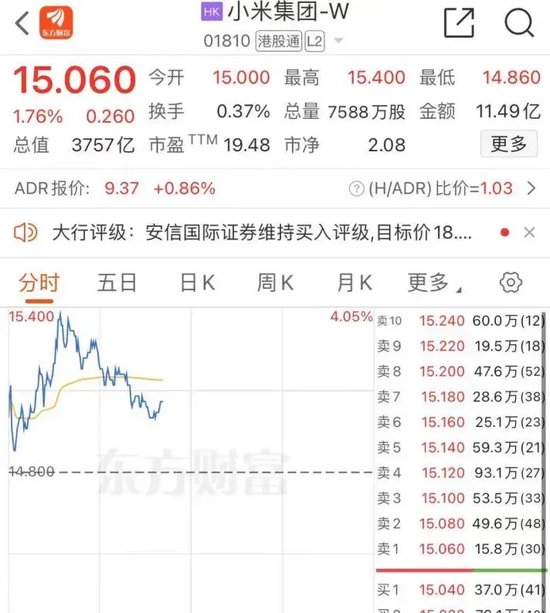 港股方面,小米集团-W盘中一度涨近4%,截至发稿,该股上涨1.76%。