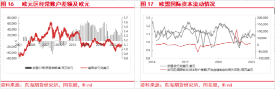 2022年俄乌冲突以来由于国际能源价格大幅上涨,欧元区能源进口价格大幅上涨,经常账户急剧恶化。商品贸易由2021年的顺差689亿欧元转变为-4320亿欧元,与此同时欧元同期大幅贬值至平水水平。