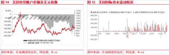 资本与金融账户方面,每一轮美联储的货币紧缩与宽松都伴随着美元流动性的紧缺和泛滥、国际资本的流入和流出。2020年受疫情影响,全球经济陷入衰退,伴随着美联储的降息和量化宽松,资本大幅流出美国;后期随着美国经济的复苏、制造业的回流以及美联储的加息,资本大幅回流美国,2022和2023年海外投资者买入美国证券以及国际资本净流入均超过万亿美元。资本的流入是美元走强的原因之一。