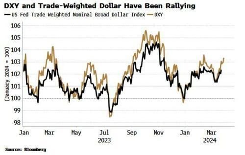 White认为,这一波涨势主要是受到发达市场货币(如瑞士法郎和日元)抛售的推动,使DXY的表现超越了包括新兴市场和发达市场货币在内的广泛贸易加权美元指标。