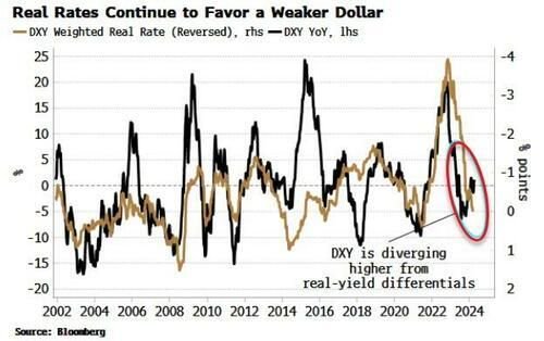 通过比对DXY篮子中的货币(欧元、日元、英镑、加拿大元、瑞典克朗、瑞士法郎)与美元的实际收益率,并按DXY计算的相同权重求和,我们得到了一个DXY加权实际利率指标。正如下图所示,DXY目前背离这一指标走高。