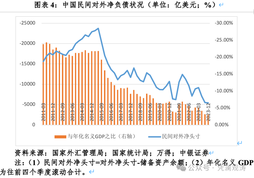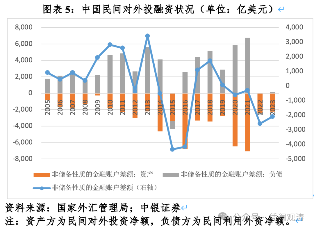 一方面,与“8·11”汇改之前二十多年的人民币单边升值行情下民间资产本币化、负债美元化不同,现在民间货币错配明显改善。到去年底,民间对外净负债5415亿美元,相当于名义GDP的3.0%,较2015年6月底分别下降了1.83万亿美元和18.7个百分点。经历2015和2016年两年民间集中增加海外资产配置、集中偿还对外债务的调整后,我国对外金融部门趋于稳健。正因如此,2019年8月人民币破七,但外汇市场有惊无险。从国际收支口径看,2015和2016年,我国每年资本净流出6000多亿美元(含净误差与遗漏),而2022年净流出3054亿美元,2023年进一步降至2482亿美元。