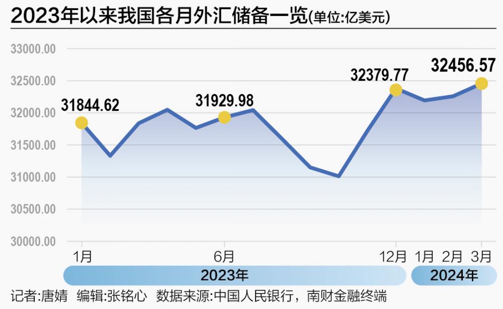 国家外汇管理局4月7日发布数据显示,截至2024年3月末,我国外汇储备规模为32456.57亿美元,较2月末上升约198亿美元,升幅为0.62%。值得注意的是,这已经是我国外汇储备连续四个月站稳3.2万亿美元大关,而2023年外汇储备全年稳定在3.1万亿美元以上。