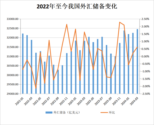 4月7日,国家外汇管理局公布数据显示,截至2024年3月末,我国外汇储备规模为32456.57亿美元,较2月末上升约198亿美元,升幅为0.62%。