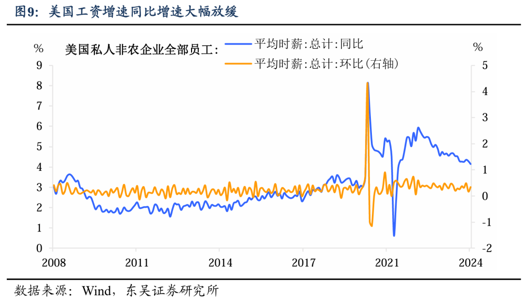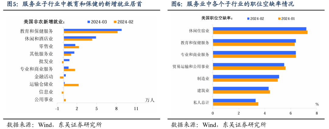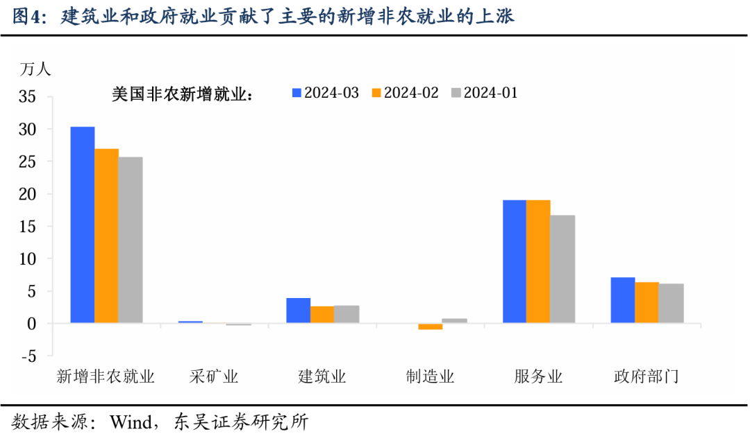 从结构上,新增非农就业上涨集中在三个部门:医疗保健服务、政府和建筑业。具体来看,3 月医疗保健行业增加了 7.2 万人,政府部门增加了 7.1 万人。其他显著增长的领域包括建筑业,3 月增加了 3.9 万。服务业中,休闲和酒店业增加了 4.9 万,教育和保健服务、休闲和酒店业的新增就业增长是该类就业上升的主要因素。