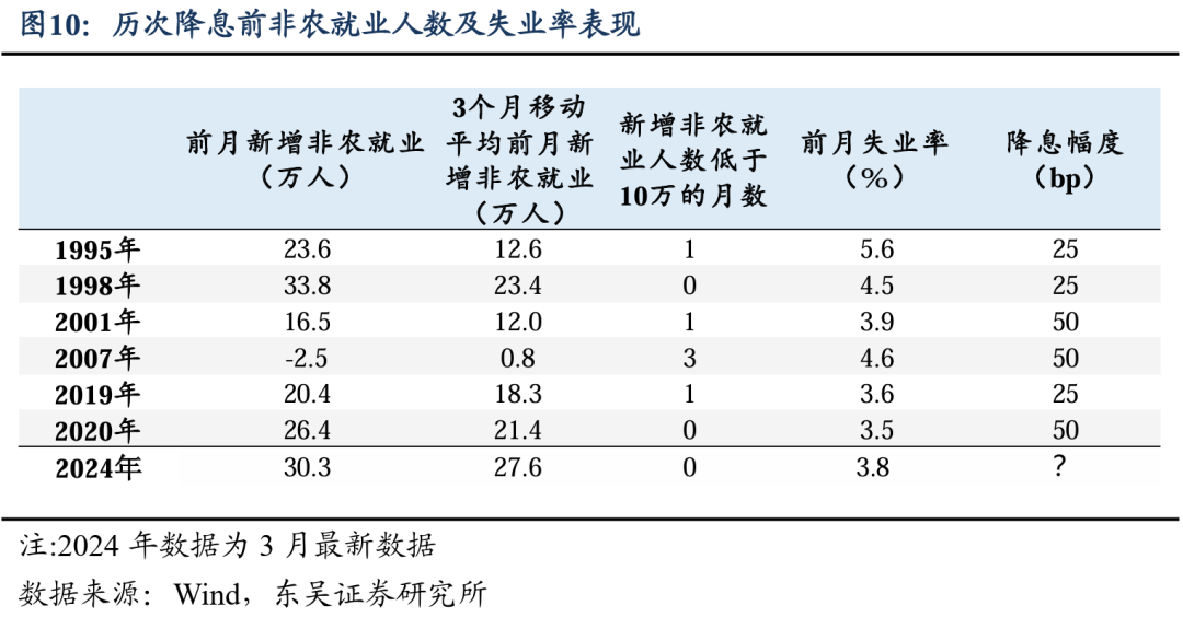 3月非农稳影响的只是联储的耐心、不是决心。如果从历史的角度来看,降息的前3个月内,大部分情况下均有 1 次新增非农就业人数不及 10 万的表现。例如1995年,虽然非农数据表现尚可,但失业率5.6%处于半年来平均水平;再比如2001年,降息前美国各项经济指标都出现恶化,降息前3个月非农就业移动平 均降至12万人。更极端一点的则是2007年,降息前非农就业人数经修正后不断被调低,8 月非农就业已降为负值。