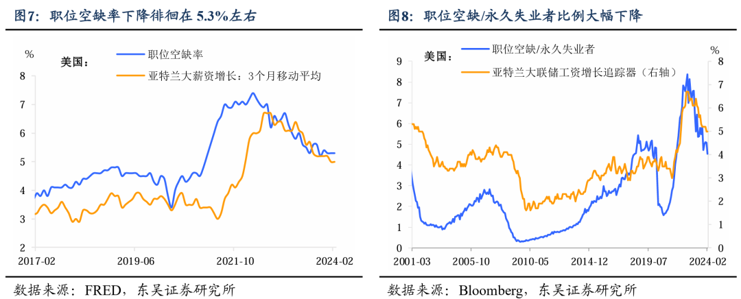 职位空缺与非临时裁员需进一步降温。供需失衡是劳动力市场偏紧的主要 原因,整体来看,3 月职位空缺率连续徘徊在 5.3%,这表明即便下岗,找到新的工作也并不困难,因此这足够防止失业率以自我强化的方式不断上升。而职位空缺/非临时裁员的比例可以很好的解释工资通胀。此比例虽较高点已经大幅下滑,但需要继续放缓才能使得工资通胀进一步降温。