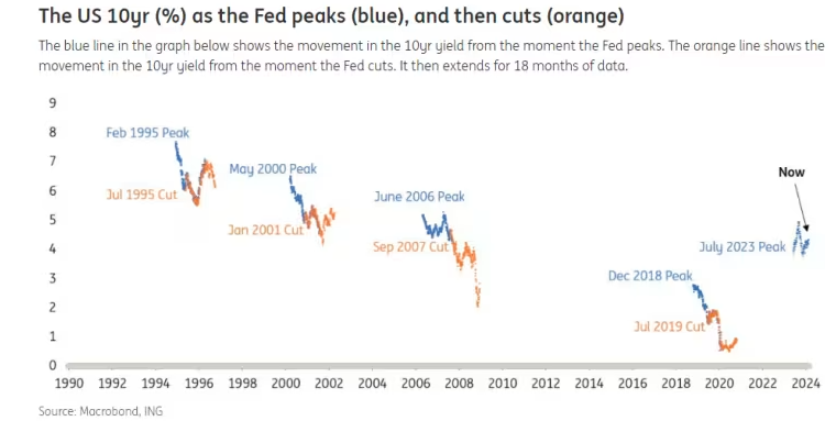 荷兰国际集团美洲地区研究主管Padhraic Garvey就表示,当下10年期美债收益率的走势,几乎截然不同于以往美国利率触顶时。他指出,如果美联储真的已经完成了加息,那么10年期美债收益率便远未跌到预期水平——在美联储去年7月最后一次加息的三个月后,该收益率在去年10月曾触及5%的周期高点,而现在依然高企。