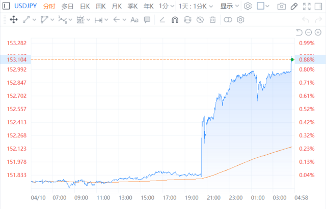 【日元继续走贬 美元兑日元进一步升至153以上】财联社4月11日电,日元继续走贬,美元兑日元USD/JPY向上升破153关口,续创1990年6月以来新高,现报153.18,部分机构将153关口作为日本当局出手干预的主要节点。