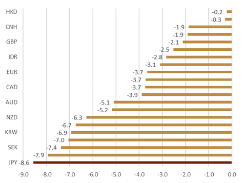 资料来源:彭博资讯,中金公司研究部图表2:2024年初以来G10货币以及亚洲货币相较美元的变化幅度(%)