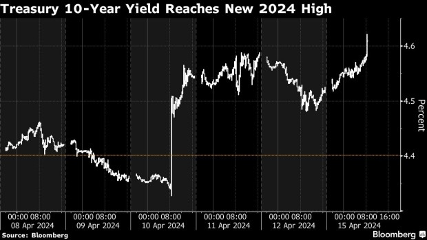 零售销售数据公布后,美国国债收益率触及年内新高,美国10年期国债收益率在零售销售数据公布后上升,当日上涨11.9个基点至4.618%,为去年11月14日以来的最高水平;美国2年期国债收益率当日上涨11.1个基点至4.993%。美元指数DXY短线上涨20点,现报106.14。现货黄金短线走低6美元,现报2352.58美元/盎司。美国股指期货回落。