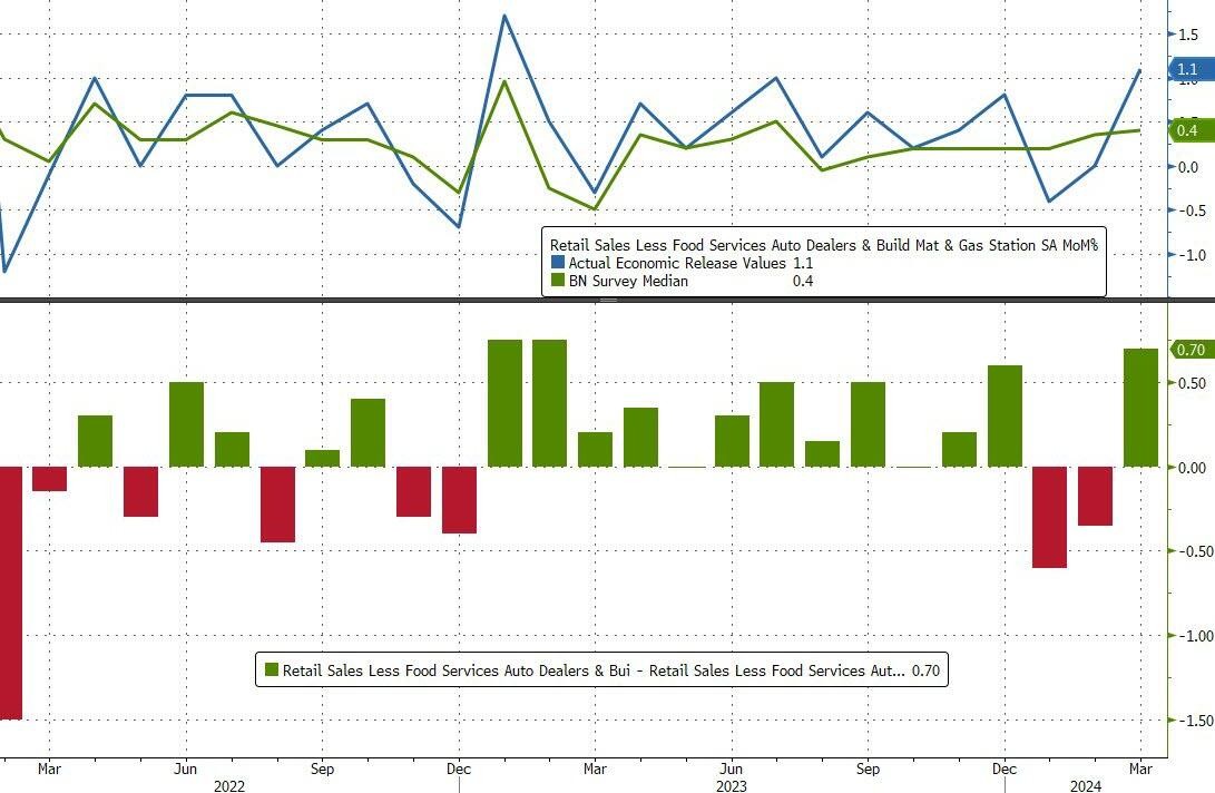 智通财经获悉,美国商务部公布的数据显示,美国3月零售销售月率为0.7%,超出市场预期的0.3%,创去年9月以来新高,前值从0.6%上调至0.9%。美国3月核心零售销售(除汽车)月率 1.1%,预期0.4%,前值0.3%。美国3月零售销售(除汽车与汽油)月率1%,预期为0.3%,前值上修至0.5%。