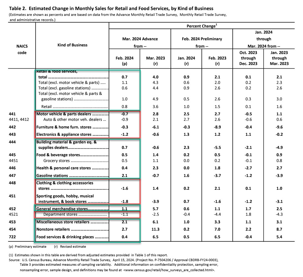 13个类别中有8个类别出现了增长,其中以电子商务为首。由于价格上涨,加油站的销售额增加,而服装商店、家具、电器和消费电子产品以及汽车销售额下降。作为经济晴雨表的餐饮业销售额也增长了0.4%——因为当经济健康,美国人对工作有安全感时,餐馆的销售额往往会上升,这是报告中唯一的服务业类别。