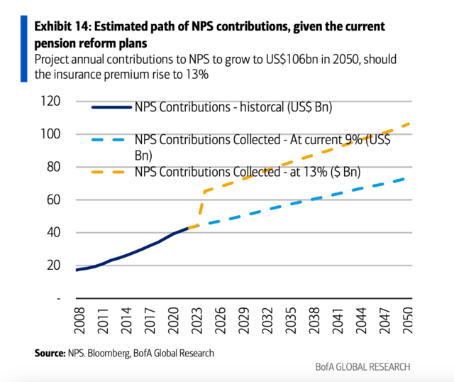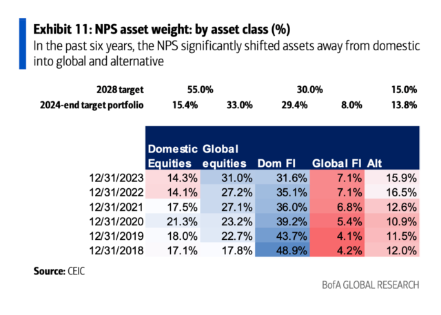 数据显示,在2023年NPS将313亿美元分配给海外资产,创下历史纪录。如果保险费上升到13%,美银预计到2050年年度海外购买将增至690亿美元,因此成功的养老金改革以及将NPS的资产负债表重新定向到海外资产,将在中期内对韩元构成重大不利影响。
