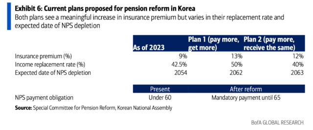 目前,韩国国会的养老金改革特别委员会希望在今年5月完成改革。改革包含两个方案:第一个方案为“多付多得”,即将保险费从当前的9%提高到13%,但将替代率提高到50%;第二个方案则是略微增加保费,但维持相同的替代率。两个计划都将养老金强制缴纳最高年限从60岁延长到65岁,预计可讲养老金耗尽的日期从2043年推迟至2062-63年。