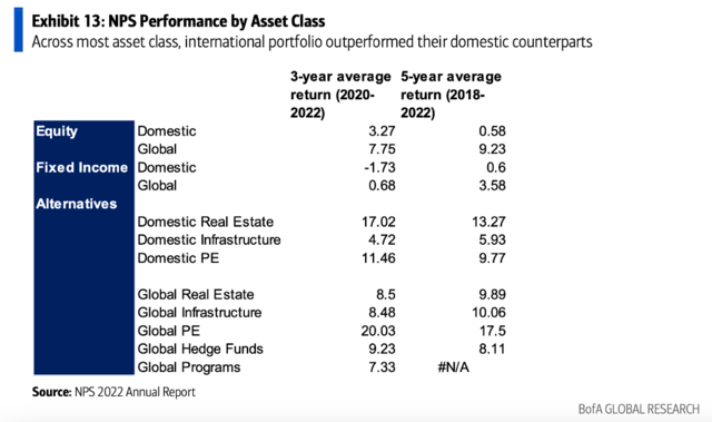 此外,2023年10月,NPS评论称,鉴于人口结构的恶化,它将寻求将其目标回报率提高1%,以结构性地改善基金长期可持续性的状况。NPS还指出,希望到2028年将海外资产比例达到60%。相比之下,在2023年,全球股票和固定收益仅占总资产的38.1%。