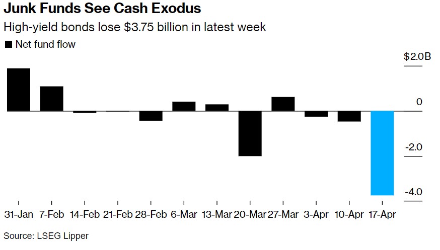 LSEG Lipper的数据显示,截至4月17日当周,投资者们从美国垃圾级债券基金撤资大约37.5亿美元,为14个月来的最大规模撤资。与此同时,各期限的美国国债在4月遭到大幅抛售,因稳健的美国经济数据和美联储官员们近期密集发布的鹰派言论,共同在极大程度上强化市场对利率将在更长时间内维持较高水平( higher for longer)的猜测。
