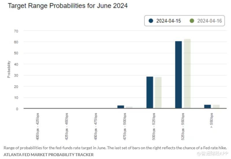 美联储亚特兰大地区银行的市场概率追踪器显示,最近的一周,有关隔夜融资利率(Secured Overnight Financing Rate)的期权交易显示出6月份加息25个基点的可能性约为3.6%。此举将使联邦基金利率目标区间从目前的5.25%至5.5%上调至5.5%至5.75%。