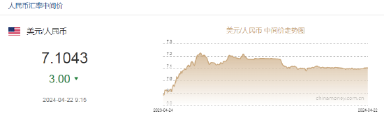 4月22日,人民币中间价报7.1043,上调3点,上一交易日中间价报7.1046。