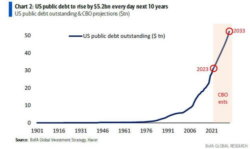 根据美国国会预算办公室(CBO)的预测,到2033年,美国债务规模将在十年内增加到52万亿美元,平均每天增加52亿美元。