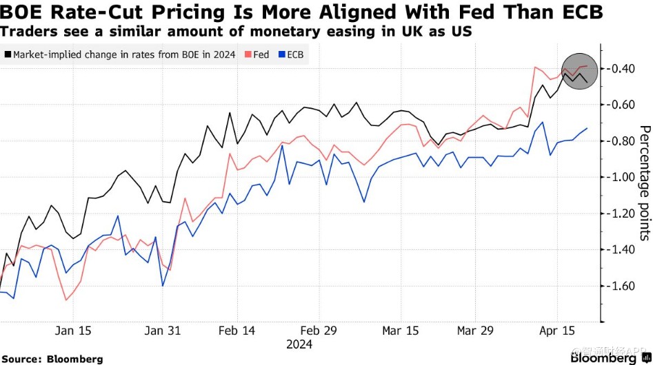 Bloomberg上周发布的一项经济学家调查显示,大多数人预计英国央行将在6月份首次降息25个基点,并在年底前降息整整一个百分点。与此同时,市场对2024年降息次数的预期已经从今年年初的6次降至现在的2次。