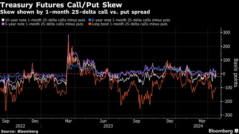 过去一周风险增加最多的期权包括执行价94.375的合约,这是鹰派仓位的押注。相关期权的目标押注目前是年底收益率约为5.625%至5.875%,高于目前5.33%的美联储有效利率。不过,并非都是单向押注,执行价96.00和97.00看涨期权的风上周增加最多,该价差的目标是美联储在年底前大举降息。