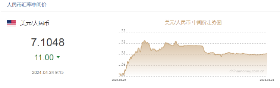 4月24日,人民币中间价报7.1048,上调11点,上一交易日中间价报7.1059。