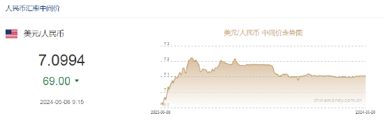 5月6日,人民币中间价报7.0994,上调69点,上一交易日中间价报7.1063。