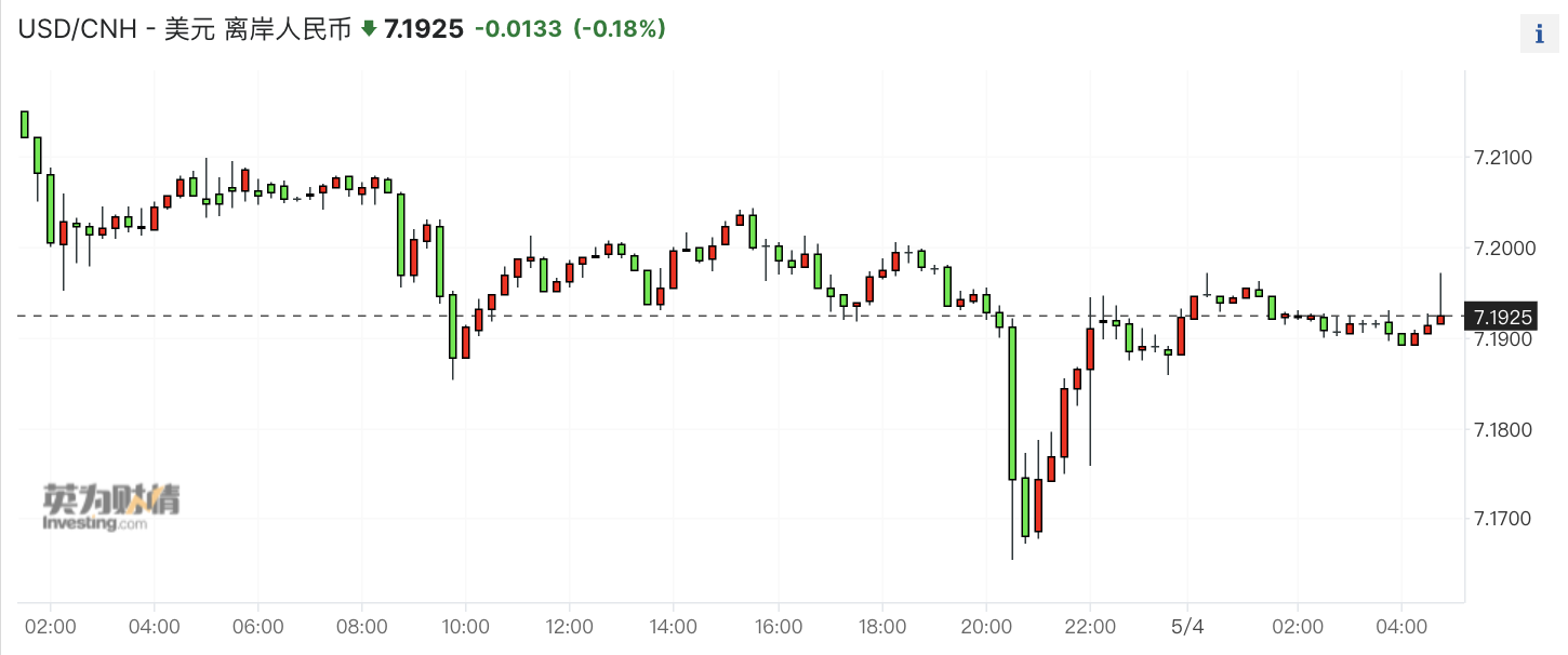 随着港股市场的回暖,离岸人民币的表现也颇为抢眼,假期当周大涨近700点。截至4月30日收盘,美元/人民币报7.2411,截至5月3日收盘,美元/离岸人民币报7.1925。