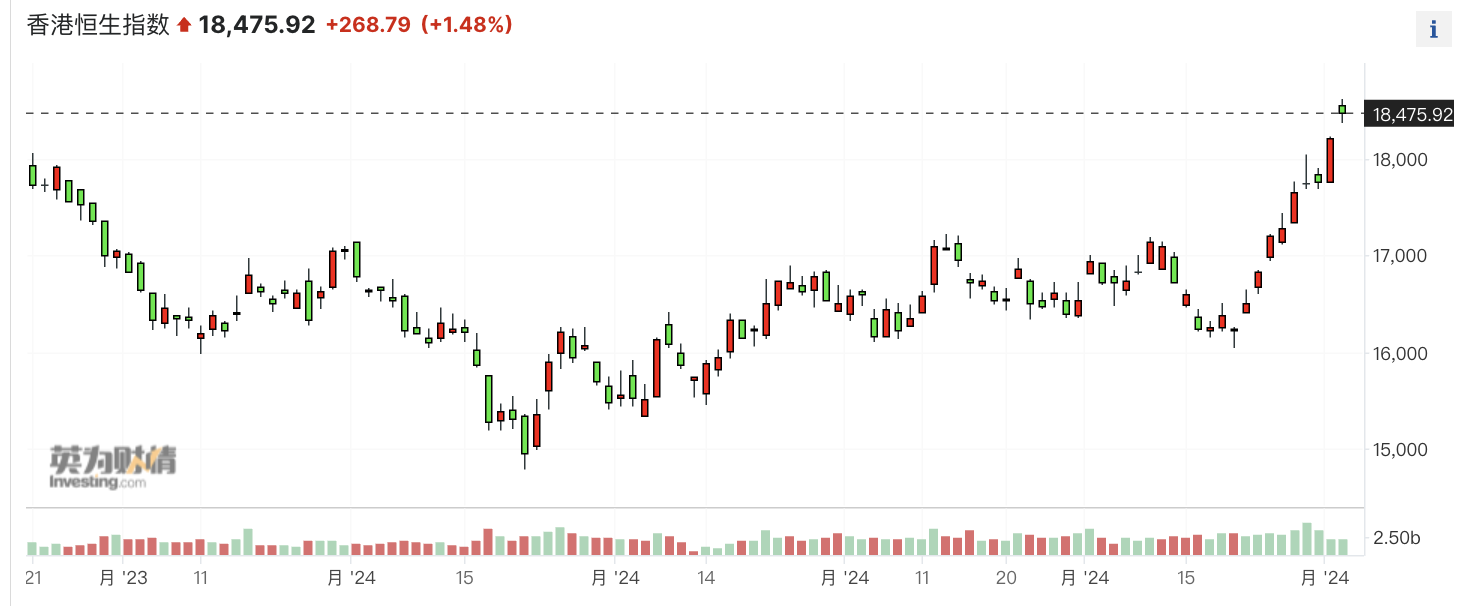 香港恒生指数在2024年1月22日触底,当日收盘报14961点,跌回了1997年的水平。然而,再平淡的市场也会出现技术性反弹,4月15日当周,恒指大幅跳升7.5%,领涨全球主要股指,而后持续攀升。