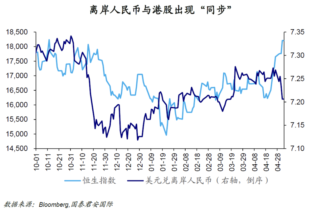 五一黄金周的出行数据无疑会得到更多的关注,总体而言,投资者对于港股的信心有明显上升。而推升这一轮港股行情的,主要是南下资金。由于港股近期表现出色,一些海外资金也开始出现加仓,市场短期对于人民币的看法也会偏正面。
