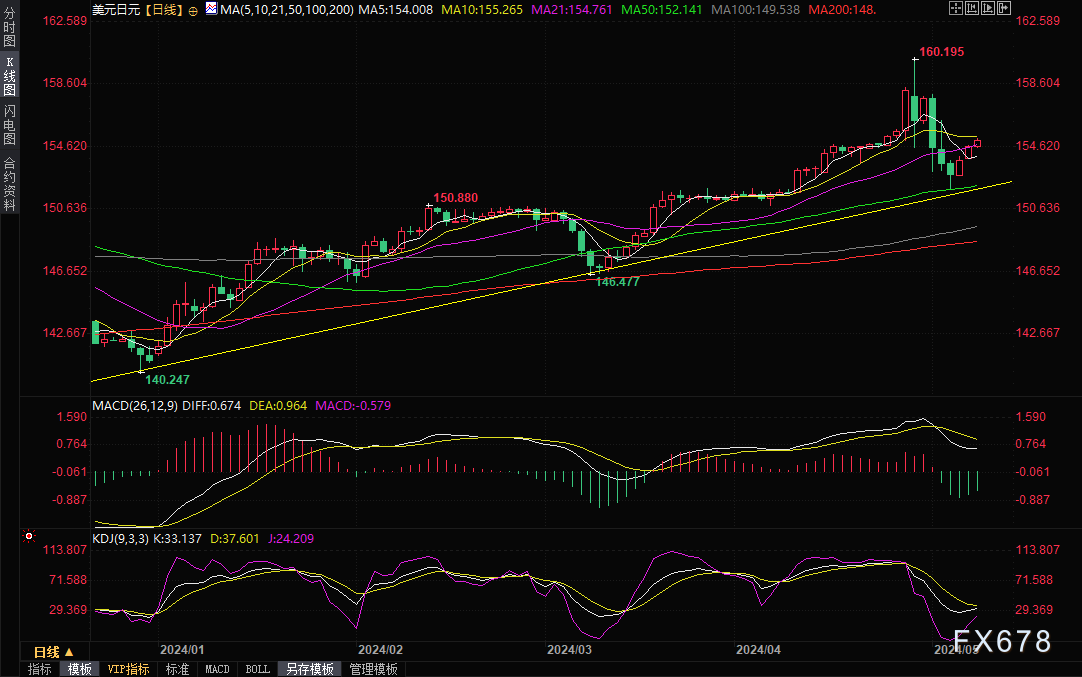 美元兑日元周三最高触及155.18,为四个交易日新高,涨幅约0.32%,远离上周日本当局疑似干预阻贬日元而创下的近四周低位151.86。