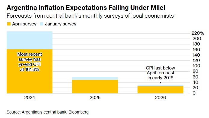 在阿根廷,总统米莱对该国饱受危机困扰的经济进行的所谓休克疗法在通胀方面取得了成效。分析师目前预计,4月通胀环比将增长9%,低于1月预测的13%,预计截至2024年年底,通胀率将为161.3%,较1月预测下降了近66个百分点。