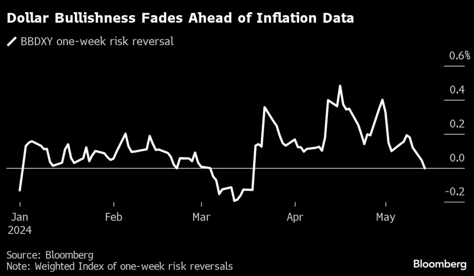 除了美债市场外,外汇市场的期权定价似乎也普遍认为,今晚的美国CPI数据可能低于预期,期权交易商一直在积累对美元的看跌押注。近来一直为正值的彭博美元指数一周风险逆转指标周二跌破了0,为两个月来首次。CFTC的数据也显示,截至5月7日当周,交易员们正在大量撤回看涨美元的押注。包括对冲基金和资产管理公司在内的非商业投机者目前对美元的净多仓已降至了约240亿美元,这是自4月初以来的最小规模。
