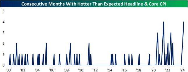 先来看一组统计——自从本世纪以来,美国CPI数据还从来没有出现过连续五个月实际公布值超出市场预估值的情况,之前的最高纪录就是目前保持的(截止3月数据)以及2021年所出现过的四次。