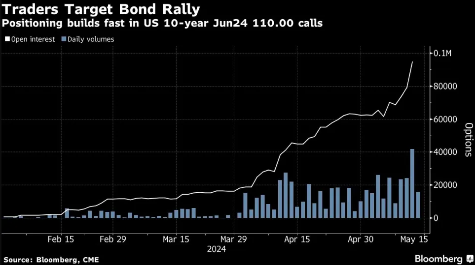 过去一周,交易者大量买入了那些将在10年期美债收益率降至约4.3%时获益的期权,这一水平比隔夜收盘价低出了近15个基点,同时也将预示着这一“全球资产定价之锚”或会跌至一个多月来的最低位。一笔尤其引人注目的高风险交易是:如果10年期美债收益率在5月24日之前进一步降至4.25%,该笔成本为15万美元的押注将赢得1500万美元的巨额收益。