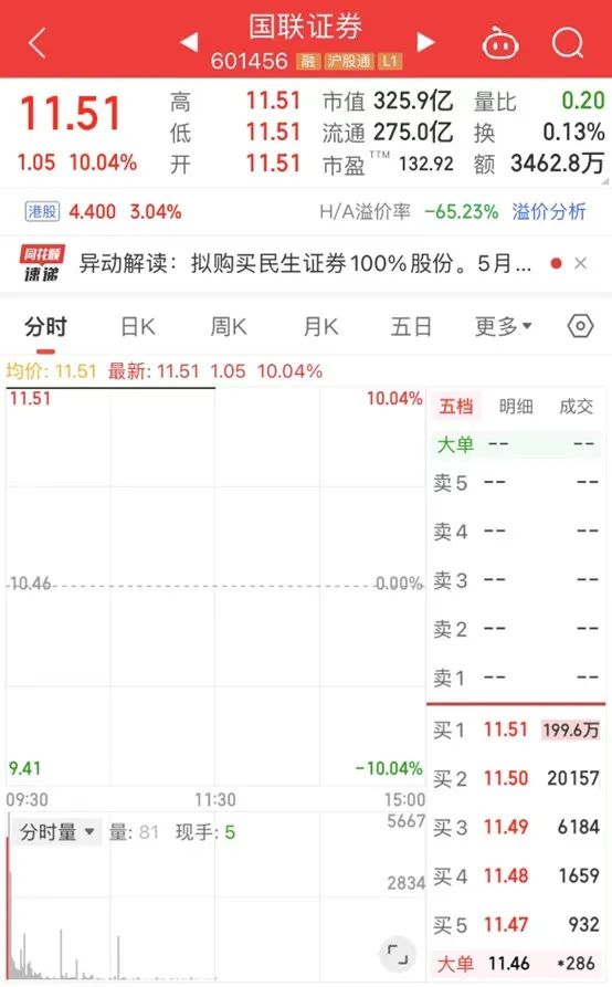 国联证券一字板涨停,截至上午收盘,涨停板上仍有逾199万手大单。5月14日晚间,国联证券公告称,拟发行A股股份购买民生证券100%股份,并募集不超过20亿元(含本数)配套资金。