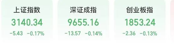 截至午间收盘,上证指数下跌0.17%,深证成指下跌0.14%,创业板指下跌0.13%。