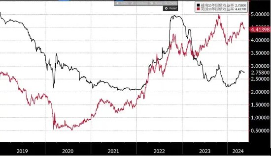 图5:越南和美国国债利差拉大(红线:美债收益率,黑线:越南国债收益率)