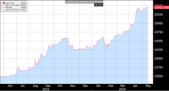 2022年开始美联储进入加息周期,而越南央行为了刺激经济下调利率,使得越南和美国两国利差倒挂。同时今年以来市场对美联储降息预期减弱,美元指数一路走高。上述两个因素共同作用,导致越南盾汇率在最近出现较大幅度贬值。